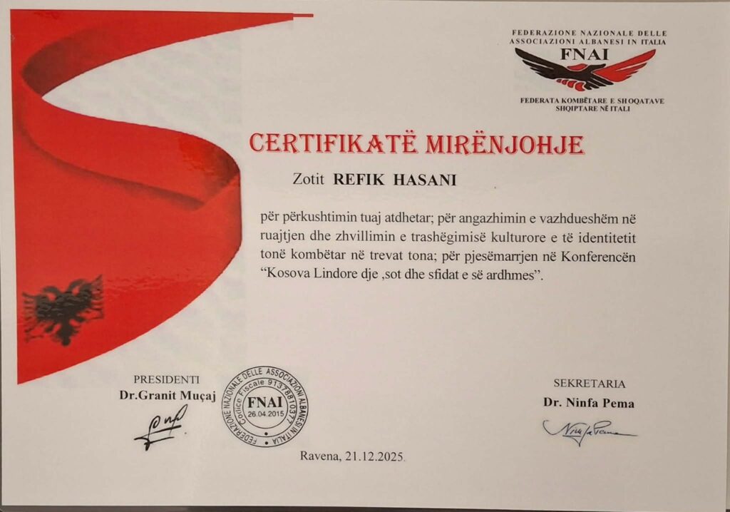 Kumtesa e Refik HASANI-t, Master Shkencor, nga Bujanoci, e paraqitur para të pranishmëve në konferencën, me temën: “Kosova Lindore, dje, sot dhe sfidat e së ardhmes”, e organizuar nga Federata Kombëtare e Shoqatave Shqiptare në LUGO DI RAVENNA, të Italisë, më 21 dhjetor 2025.