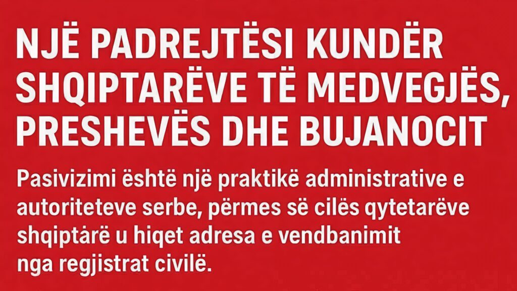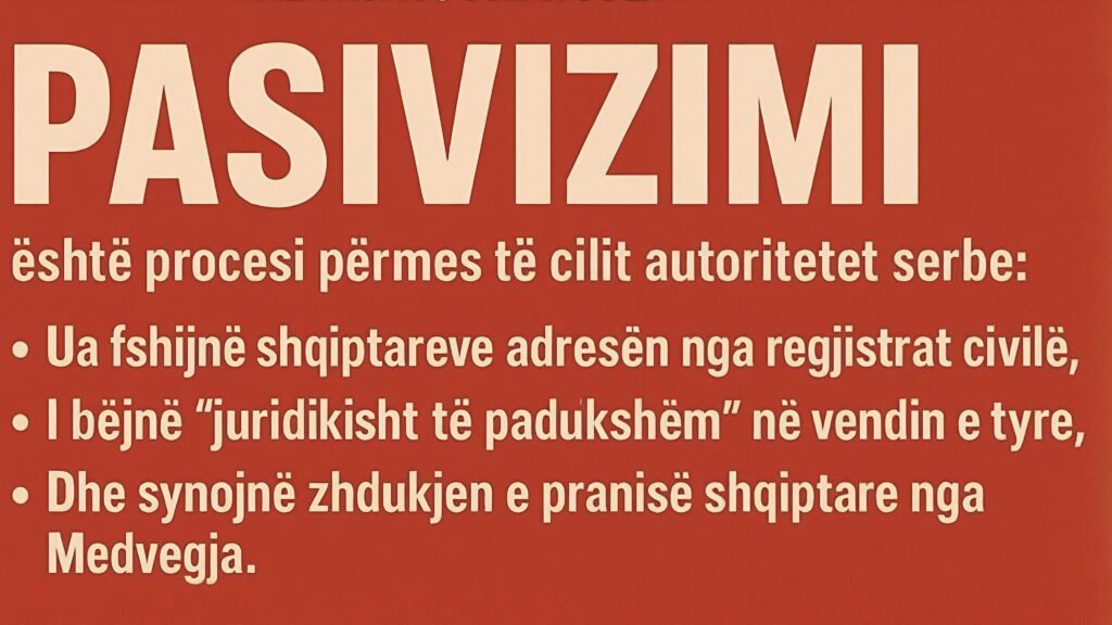 Çfarë është pasivizimi? – Pasivizimi është një praktikë administrative e autoriteteve serbe, përmes së cilës qytetarëve shqiptarë të Medvegjës (dhe pjesërisht edhe të Preshevës e Bujanocit) u hiqet adresa e vendbanimit nga regjistrat civilë. Në momentin kur një person shpallet “pa vendbanim”, ai automatikisht humbet të drejta të rëndësishme: të drejtën për të votuar, për të marrë shërbime shëndetësore, për të përfituar pension, për të regjistruar pronë, për të rinovuar dokumente identiteti dhe shumë të tjera.