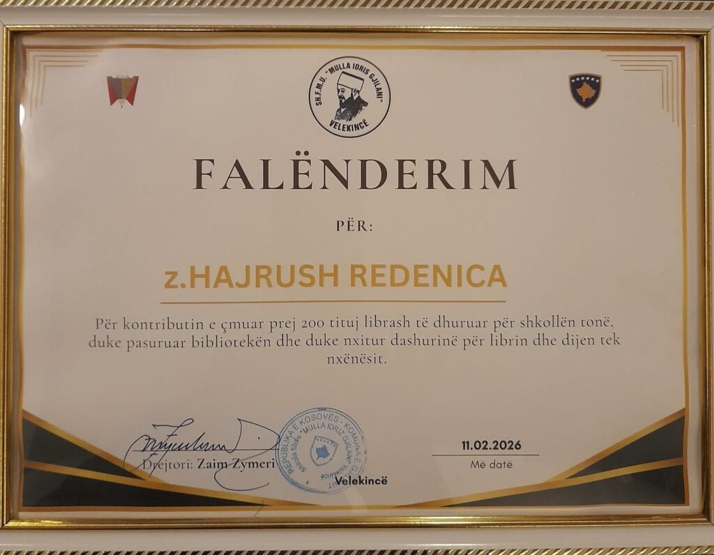 Me këtë rast, drejtori i shkollës ndau FALËNDERIM për Z. Hajrush Redenica, për kontributin e çmuar prej 200 tituj librash të dhuruar për këtë shkollë, duke pasuruar bibliotekën dhe duke nxitur dashurinë për librin dhe dijen tek nxënësit. Ky gjest fisnik u vlerësua lart si një investim i drejtpërdrejtë në edukimin dhe të ardhmen e brezave të rinj.