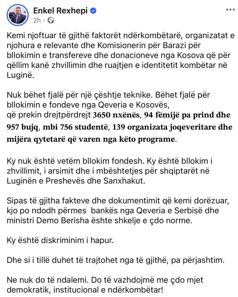 Kryetari i KKSH, Enkel Rexhepi, ka njoftuar faktorët ndërkombëtarë dhe institucionet relevante për bllokimin e transfereve dhe donacioneve nga Kosova, të cilat synojnë zhvillimin dhe ruajtjen e identitetit kombëtar në Luginë, transmeton MEDVEGJASOT.com.